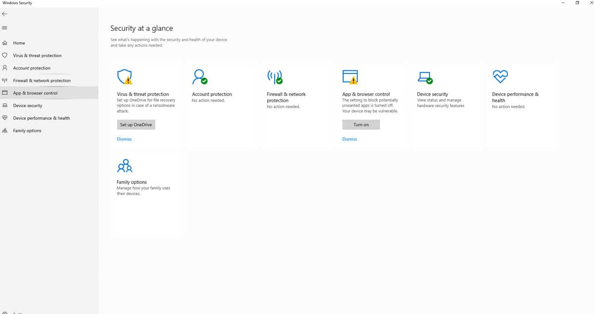Upon accessing Windows Security, you’ll be provided with your security options at a glance, showing everything that’s working well in green, alerts in amber, and threats or priority actions with a red warning.