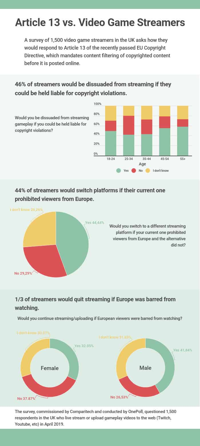 Comparitech’s survey examines the potential consequences for gameplay streamers in the European Union under Article 13. The directive stipulates that platforms must proactively filter out copyrighted content before it is posted online. This requirement could well lead to streamers and streaming platforms like YouTube and Twitch self-censoring their content in the EU.