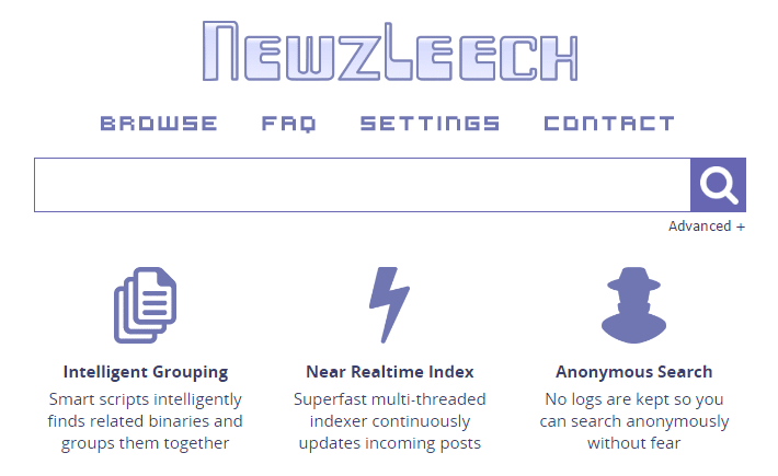 The Newzleech home page brings you straight to the search bar without fuss. The index boasts “intelligent grouping” that finds related binaries and groups them together. It claims to be a “near realtime” index that continuously updates.