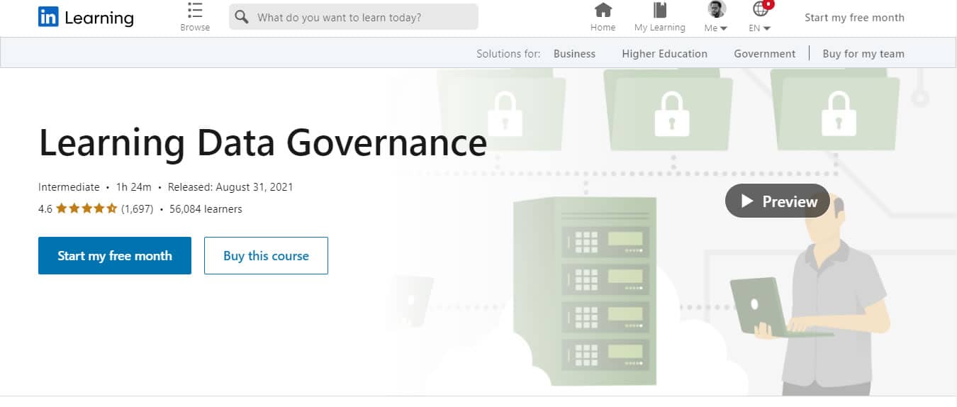 LinkedIn Learning’s Data Governance Training Program is tailored to empower professionals with the knowledge and skills needed to establish, implement, and optimize data governance strategies. The program equips participants with the expertise needed to navigate the complex landscape of data governance effectively. It covers a wide spectrum of data governance topics, from foundational principles to advanced concepts such as data stewardship, data quality management, and regulatory compliance. Participants can choose from a variety of courses that suit their specific needs and expertise levels. Equipped with this knowledge and more, you can initiate the process of implementing and achieving compliance without delay.