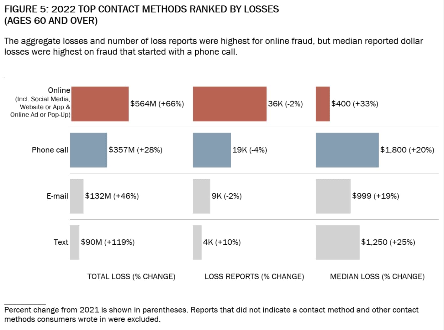 The FTC reported that the phone was the top fraud contact method reported by the elderly, with 16,000 reports. The second most common was online, with 10,000 reports. Older adults reported significantly higher losses and higher median individual losses ($1,500) on phone scams than younger consumers. This was particularly the case for those aged 80 and over which reported median individual losses of $3,500 from phone scams — four times of those reported by adults aged 20-59.
