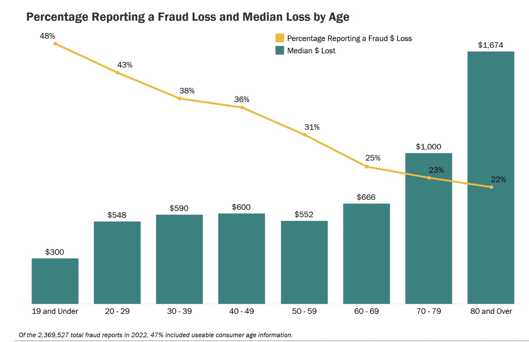 According to the FBI’s 2022 report, senior citizens are less likely to report fraud. FTC figures state 43% of younger people aged 20–29 reported losing money to fraud, and only 23% of older people ages 70–79 did the same.