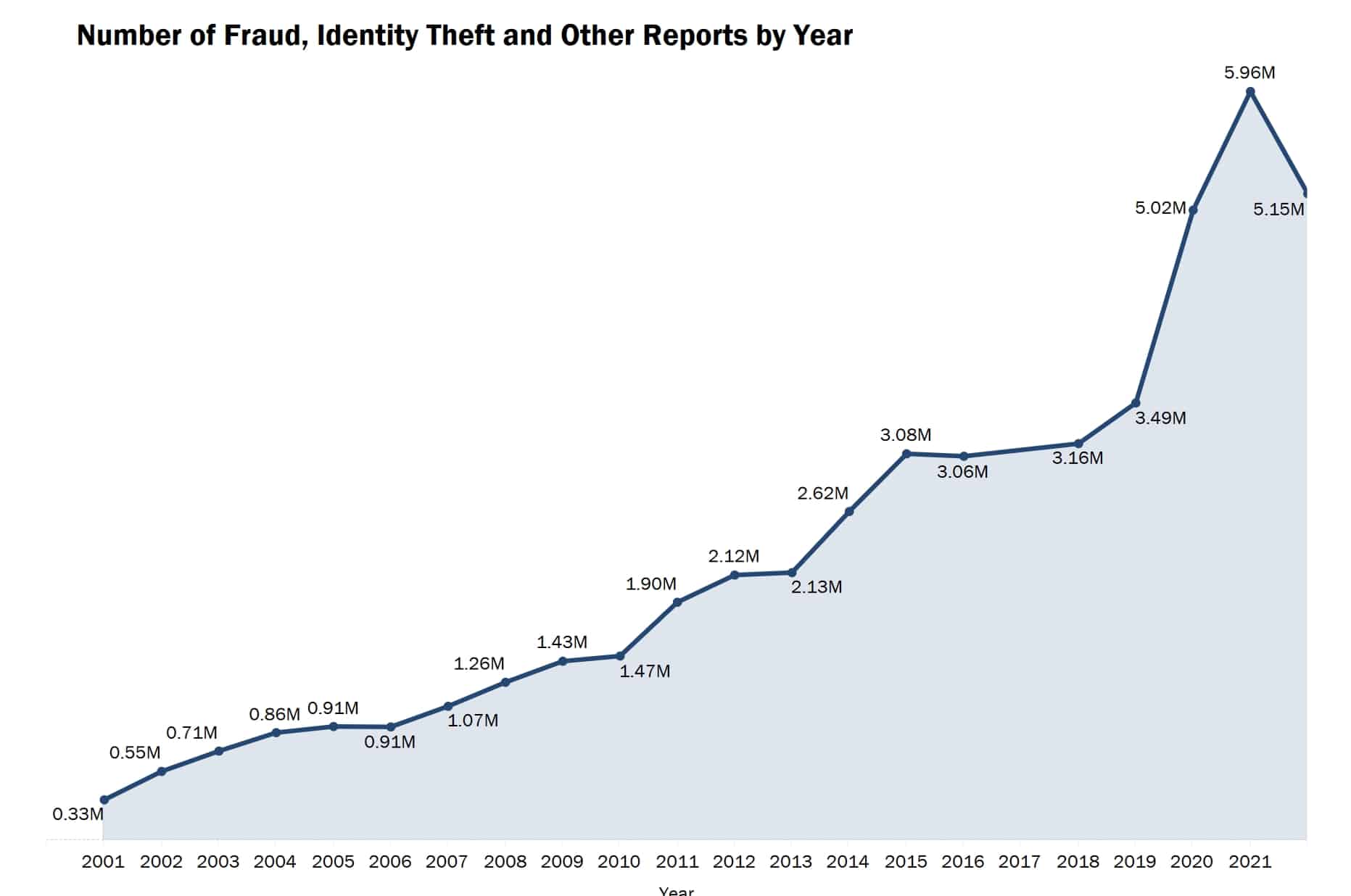 In 2001, the first year of reporting, there were 325,000 reports. By 2019, this number had risen to 3.24 million. Since then the biggest one-year increase happened between 2019 and 2020 when the number of fraud reports rose to 4.7 million (a staggering 47% increase).