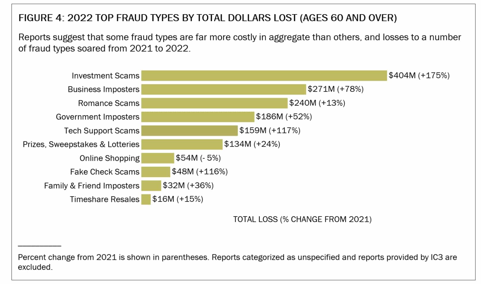 In 2022, the FTC’s Protecting Older Consumers report revealed that the most common types of fraud among the elderly are investment scams, business imposters, and romance scams.