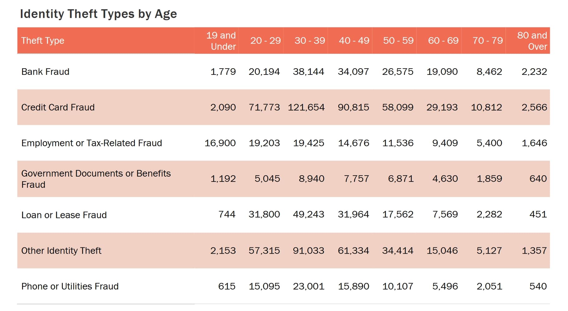 The most common identity theft type for persons aged 60 and over was credit card fraud. This percentage was highest among those aged 60–69 (46%). It was also the most common fraud type for 70–79-year-olds and 80 and over. The second most prolific ID theft type for over 60s was bank fraud.