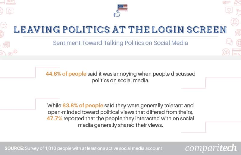 Nearly half of our respondents felt annoyed when people discussed politics on social media. And while almost 64 percent said they were open to interacting with views that differed from their own, around half said their news feeds were generally populated by people who shared similar opinions. One Pew Research Center study found that 53 percent of Americans (49 percent of Republicans and 57 percent of Democrats) found it “stressful and frustrating” to discuss politics with people who disagreed with them.