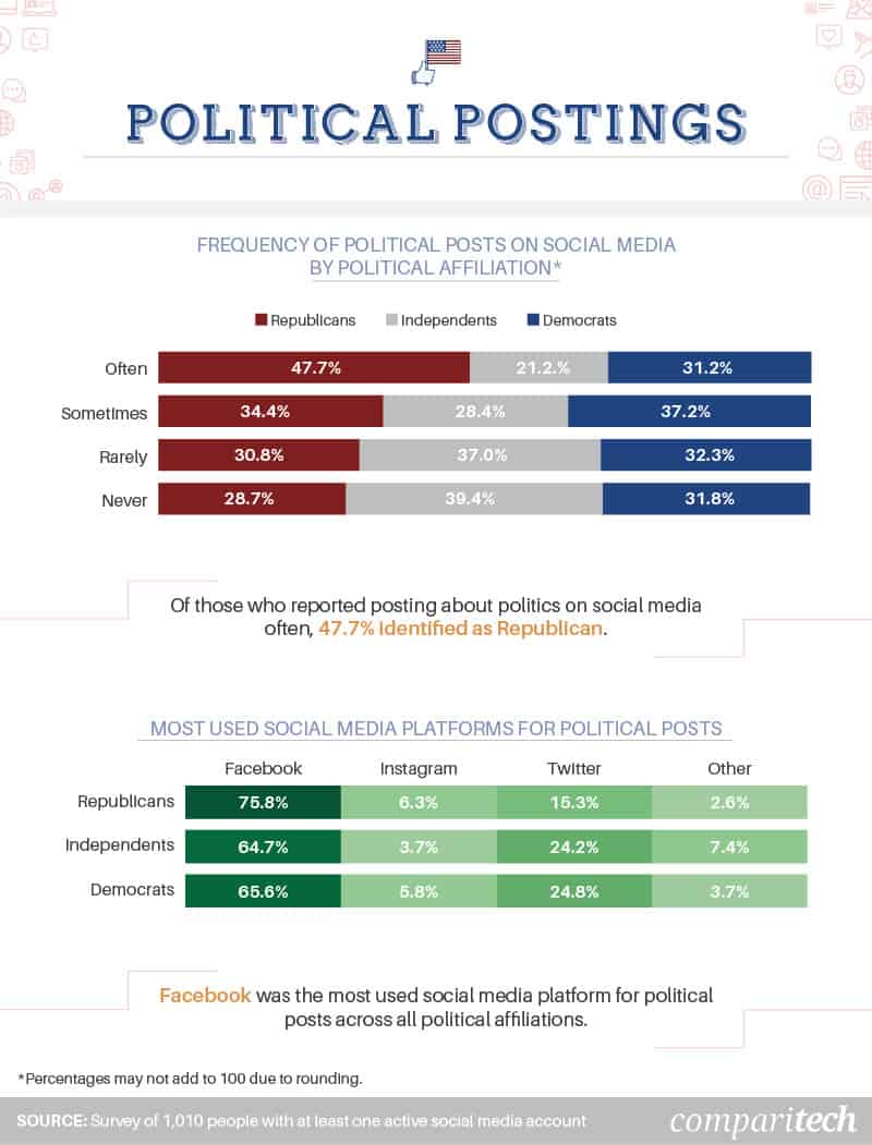 Call them thick-skinned, call them bold, call them anything you want – some studies have shown that not caring what other people think is a common trait among those who discuss politics on social media. Among respondents who reported they “often” published political posts online, nearly 48 percent were Republicans, roughly 31 percent were Democrats, and around 21 percent identified as an Independent.