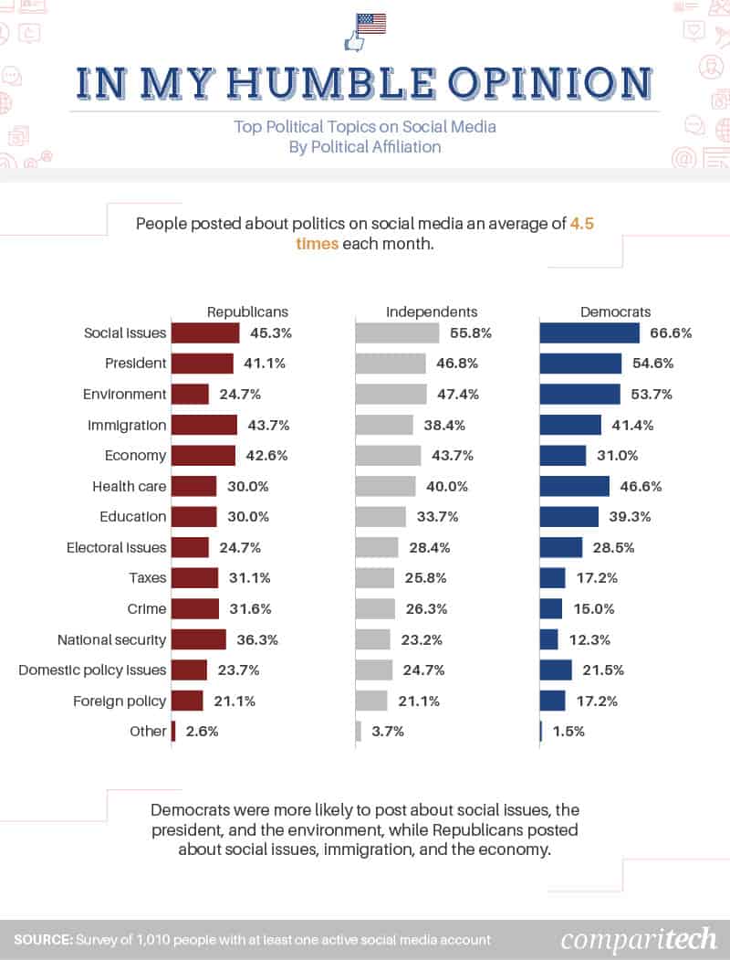 While political posts may start to blend into an indistinguishable mass of opinions, laying out the parties’ most posted topics is an interesting exercise in differentiation. The single common thread that united Democrats, Independents, and Republicans was a focus on social issues. This topic was the most popular overall, although Democrats discussed it more frequently than the other two groups.