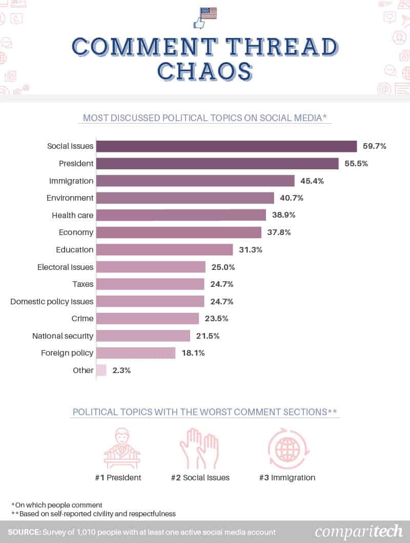 Respondents were asked about the political topics discussed in social media posts they chose to comment on. Then, based on their answers to that question, they were asked to identify which of those topics’ comment sections they deemed the worst in terms of civility and respectfulness.