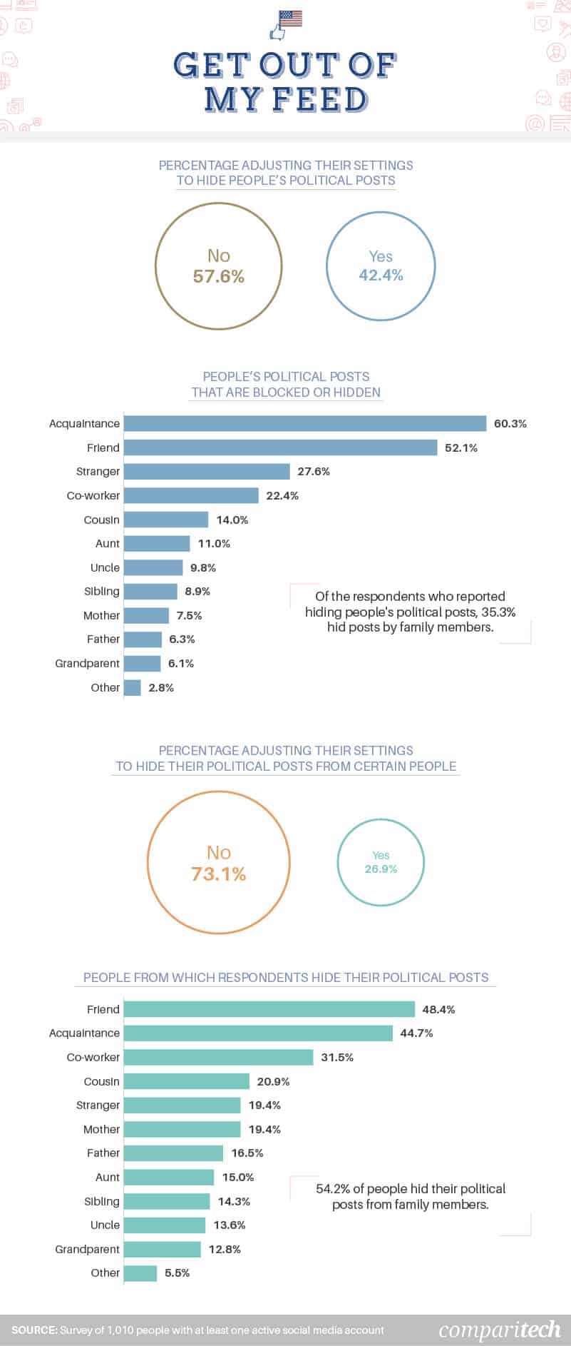 Another 42 percent of people admitted they fine-tuned their settings to hide political posts from other people, with acquaintances presenting the most frequent annoyance. When the grandstanding gets to be too much, there are multiple apps and extensions available to wipe your screen clean of politics once and for all.