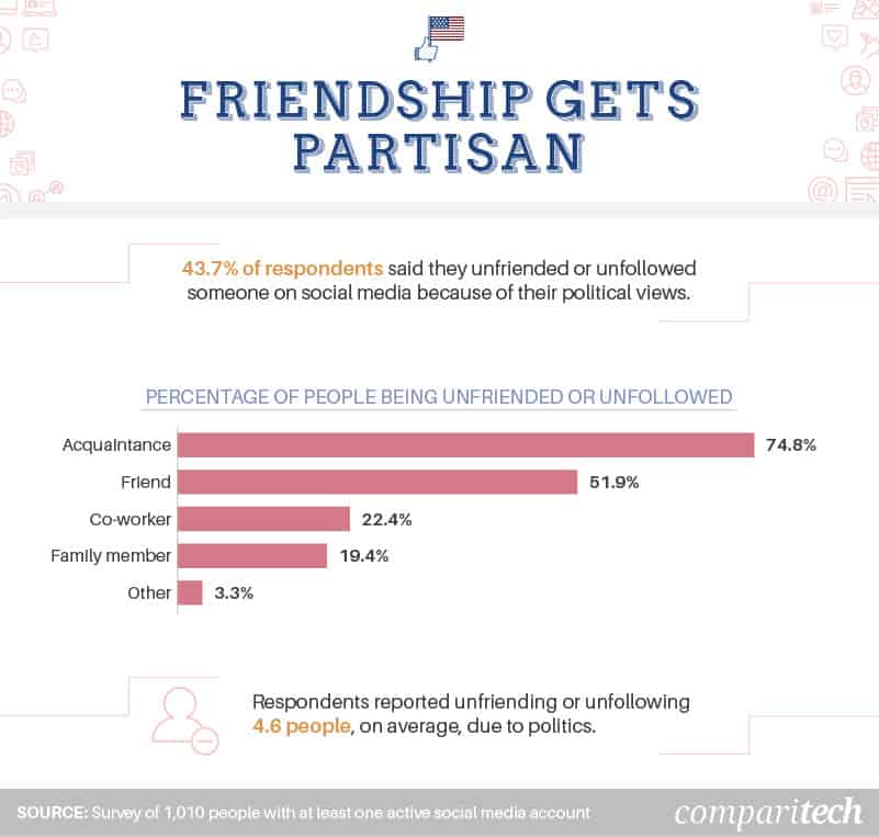 Nearly 44 percent of respondents said they deleted someone off their social media due to their political views or posts. Acquaintances were the ones most commonly being axed from social media feeds – 74.8 percent of people who admitted to unfriending someone said the person was an acquaintance. Nearly 52 percent of respondents reported removing friends, and 22 percent said they had unfriended a co-worker. Even though social media posting is often conducted off the clock, it’s usually best to keep politics out of the workplace (which does extend to the internet if you have co-workers on your social media accounts).