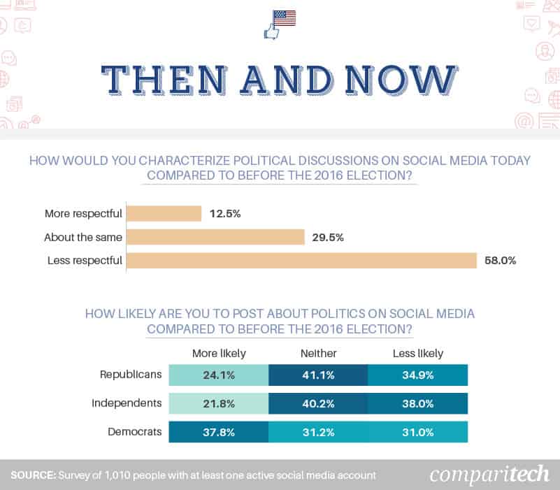 Social media has changed the way we interact with our political environment in many ways – and according to our respondents, since the 2016 election, one of the biggest changes is related to respect. Among those who had at least one active account prior to the election, 58 percent said they felt online political discussions were less respectful than they were before. Just 12.5 percent observed an uptick in respectful discourse since 2016.