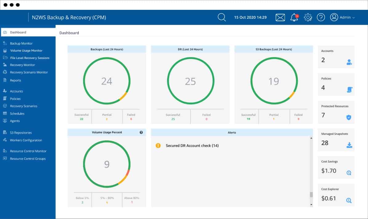N2WS Backup & Recovery is a cloud-based service is built on the AWS platform itself. It is available through the AWS Marketplace. The system is straightforward to get set up. This system offers a range of backup strategies, including whole drive backups, application backups, and object-level backup and recovery. In addition, it can back up a list of AWS services, including EBS, S3, and RDK.