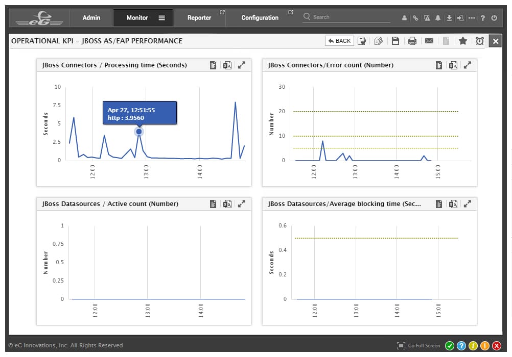 eG Enterprise monitors your entire JBoss/WildFly infrastructure and provides a single-pane-of-glass view of your JVM, web and EJB containers, application code, database connections, and more; giving you actionable insights using alerts, self-learning baseline thresholds, and built-in correlative intelligence.
