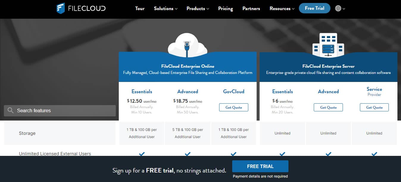 FileCloud licensing and price plans are grouped according to the Server and Online editions of the software. The FileCloud Enterprise Online comes in three price plans: Essentials ($12.50 user/month), Advanced ($18.75 user/month), and GovCloud (price available on request). The FileCloud Enterprise Server price plans include Essentials ($6 user/month), Advanced (price available on request), and Service Provider plan (price available on request).