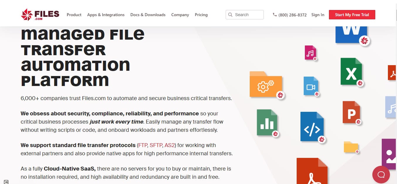 Files.com is a U.S-based cloud-native Managed File Transfer (MFT), automation, and integration platform that enables organizations to securely store, transfer, and share files between users, teams, and organizations. MFT technology provides the secure transfer of data efficiently and reliably compared to insecure technologies such as FTP and HTTP. Files.com provides a cloud-centric approach to file-based automations and integrations while emphasizing security, compliance, and data residency for business-critical file transfers and exchanges.