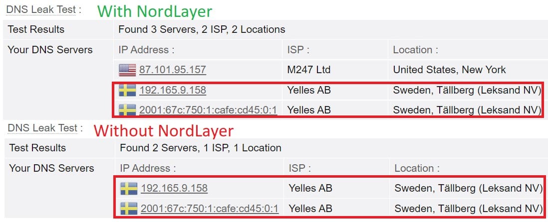 It also suffers from DNS leaks on both IPv4 and IPv6. As a result, your ISP or other snoops on your network can track which apps and websites clients use, or which networks they try to access. The screenshots below show that my ISP’s DNS servers were still visible while connected to NordLayer.