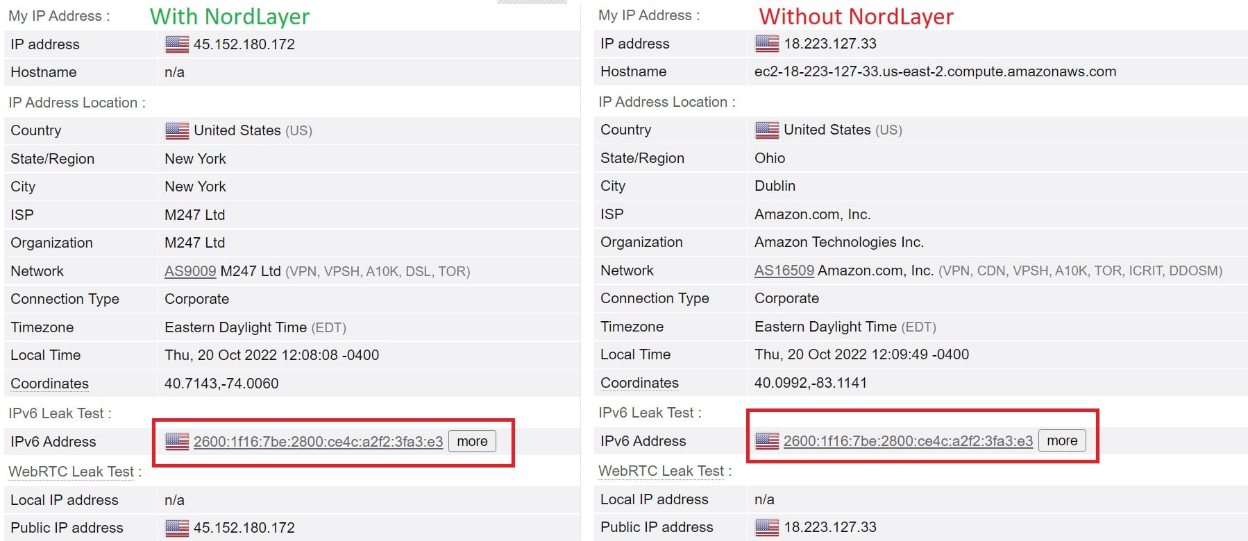 Unfortunately, NordLayer suffers from a few leaks as of time of writing. First, it fails to tunnel all IPv6 traffic, which means your IPv6 address and traffic will leak outside the VPN tunnel if you don’t disable IPv6 altogether in your end users’ device settings. In the screenshot below, you can see that the IPv6 address is not changed or hidden while connected to NordLayer on Windows:
