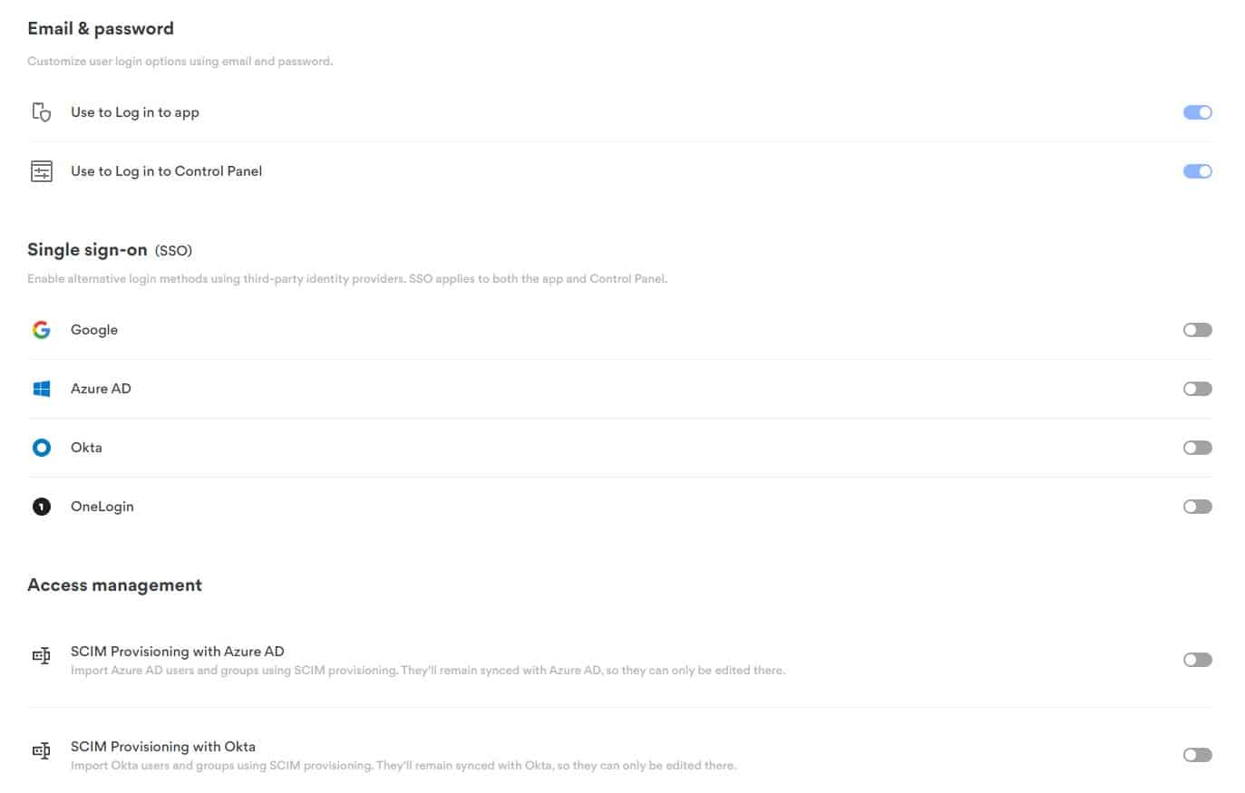 - Single sign-on (SSO) through Google, Azure AD, Okta, and OneLogin