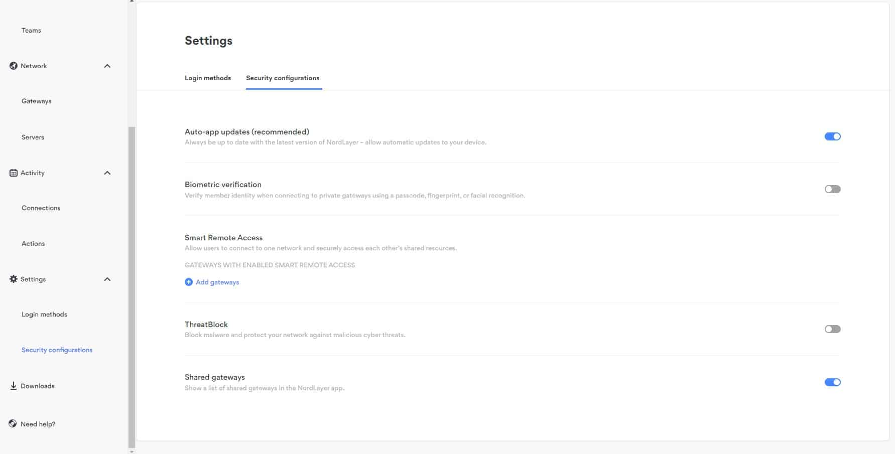 Admins can choose how users log into NordLayer. An email and password combination is the default, but NordLayer also supports: