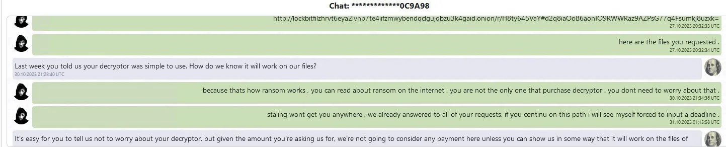 Lockbit posted chat logs on Darkfeed.io of a conversation it says took place between itself and someone negotiating on behalf of DES. In that chat, Lockbit demands $700,000, and DES requests assurances that the decryptor will work as promised. However, negotiations seem to break down after DES requests more time.